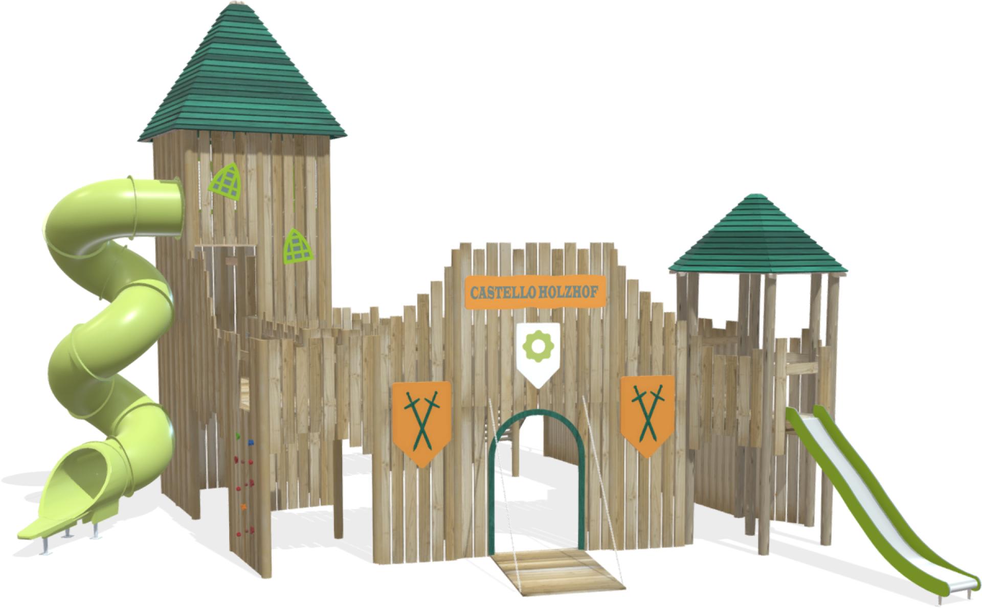 grande torre a base quadrata 200x200 cm. con pianali intermedi di risalita, tetto a quattro falde, finestrelle sagomate e finestre a bifora con rete di protezione. Altezza massima pianale 400 cm.